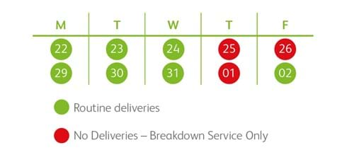 Typically, deliveries are organised for the next working day, but over the holiday period there will be some changes to our routine delivery days.